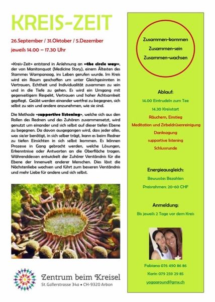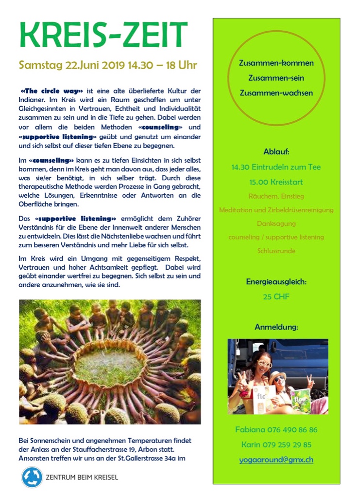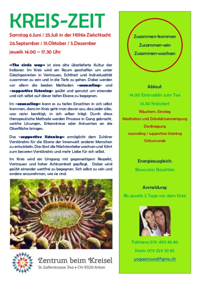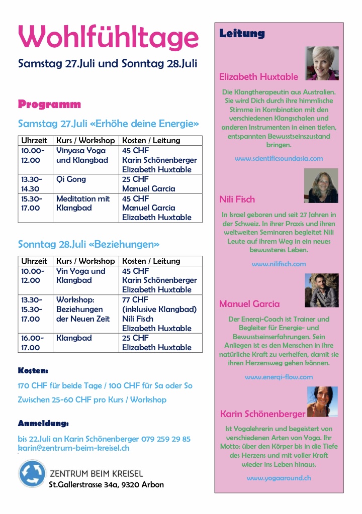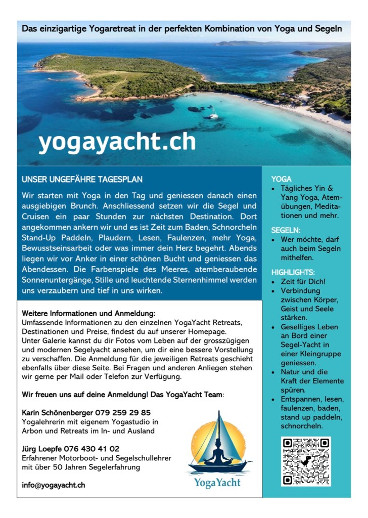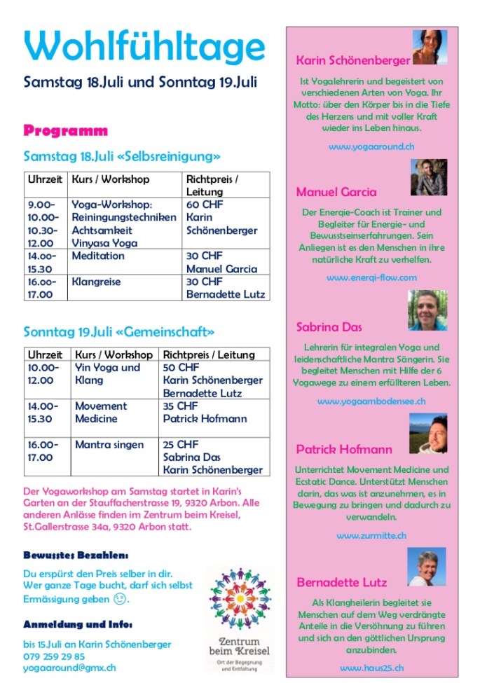 14.30 – 18.00 Uhr bei Sonnenschein und angenehmen Temperaturen findet dieser Anlass im Yogaaround Garten statt, ansonsten im Zentrum beim Kreisel