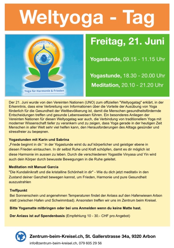 | 21.Juni | Internationaler Yogatag: offene Yogastunde am See | Wiese in der Nähe der Wunderbar, Arbon |