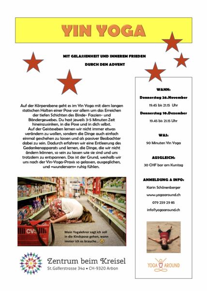 | 17.Dezember | Open Yin Yoga Samstag: Ruhe und Gelassenheit im/trotz Advent | Yoga Around Studio Arbon |