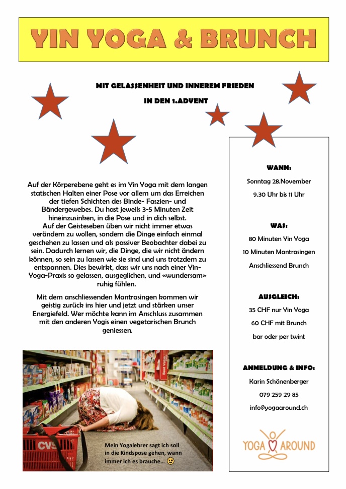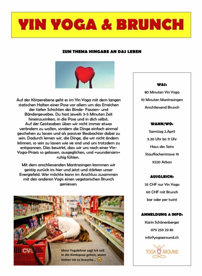 | 2.April | Yin Yoga zum Thema Hingabe an das Leben mit/ohne Brunch | Yoga Around Studio Arbon |