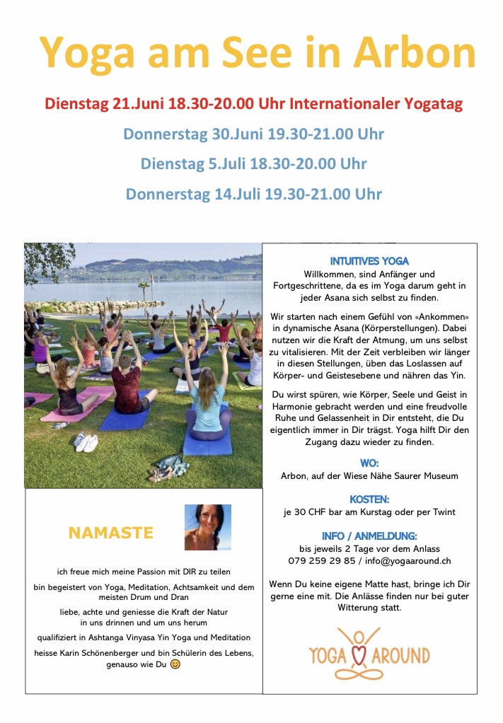 | 15.Juni | Yoga am See (offene Yogastunde für alle) | Seewiese in der Nähe Saurer Museum, Arbon |
