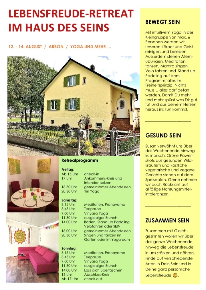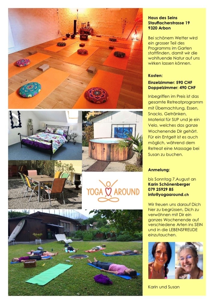 | 12. bis 14.August | Sommerretreat: Lebensfreude Intuitives Yoga (Vinyasa,Yin und Restorative), Meditation, Pranayama, Singen, Tanzen, Baden, Stand up Paddling und hoffentlich viel Sonne im Innen und im Aussen 🙂 | Haus des Seins, Arbon |
