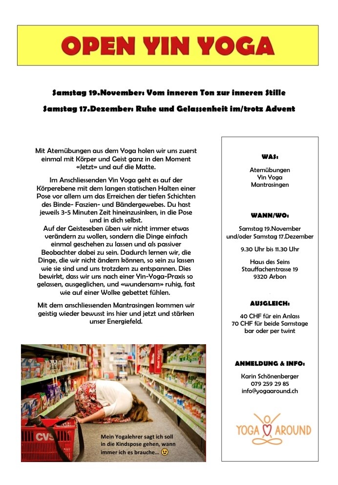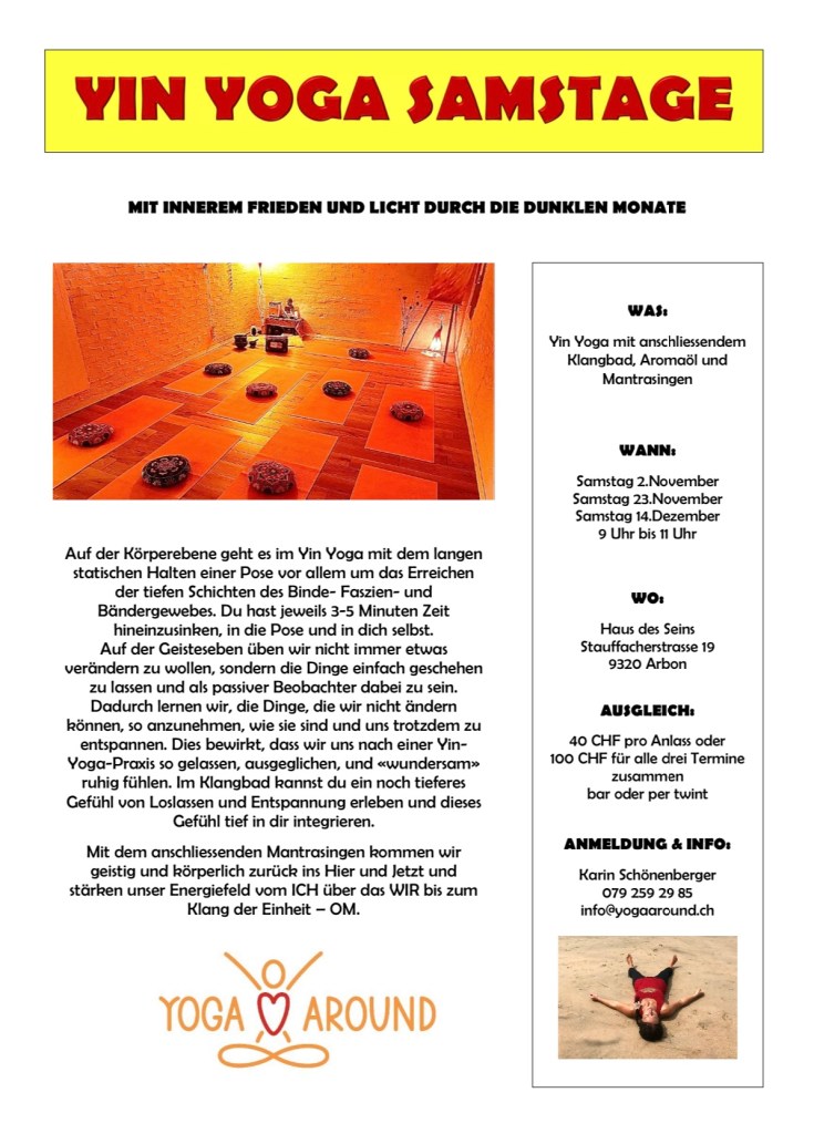 | 19.November | Open Yin Yoga Samstag: Vom inneren Ton zur inneren Stille | Yoga Around Studio Arbon |