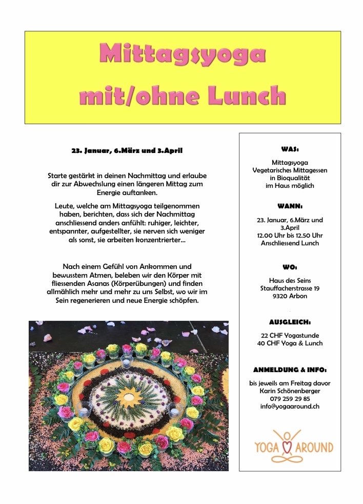 | 23.März | Mittagsyoga mit/ohne Lunch | Yoga Around Studio Arbon |