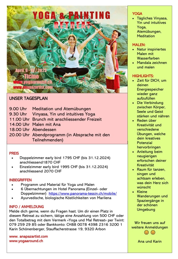 | 6. bis 12. April | Yoga und Mal Retreat im Tessin | Hotel Panorama, Pugerna (Tessin) |